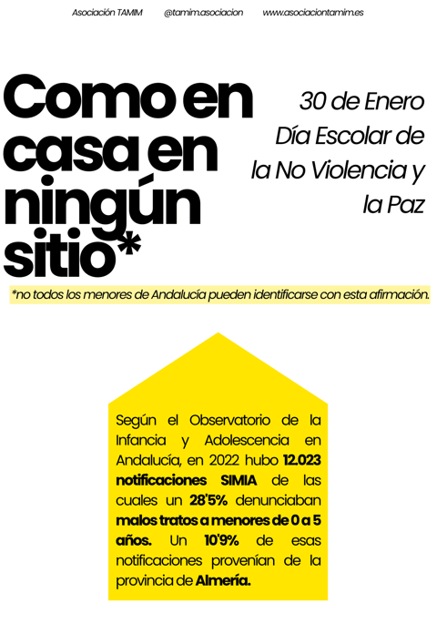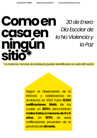 El 30 de Enero se celebra el Día Escolar de la No Violencia y la Paz. Desde Asociación TAMIM animamos a todos los docentes y trabajadores de los centros educativos a participar en la sensibilización del maltrato intrafamiliar usando nuestro cartel Como en casa en ningún sitio. Puedes descargarlo haciendo click aquí para compartirlo en tus redes sociales o colocarlo en tu escuela, negocio u otro lugar relevante. Visibilizar es el primer paso para erradicar, ¡colabora!